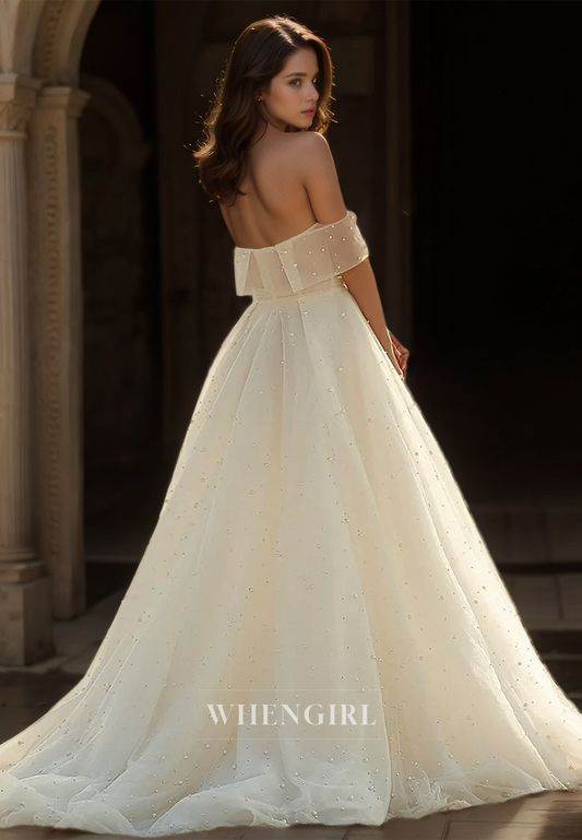 A-Line Off the Shoulder Strapless Sweetheart Glitter Wedding Dresses with Train
