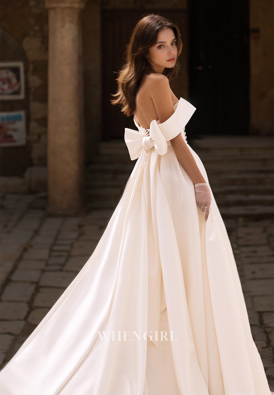 A-Line Off-Shoulder Sleeveless High Slit Train Pleats Satin Wedding Dress Bridal Gowns with Bows