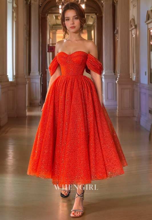 A-Line Off Shoulder Sleeveless Pleated Glitter Tulle Tea Length Prom Dress