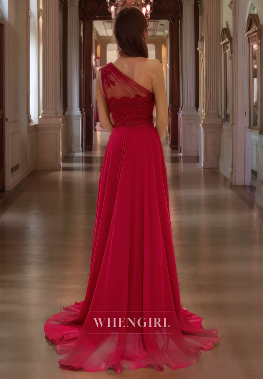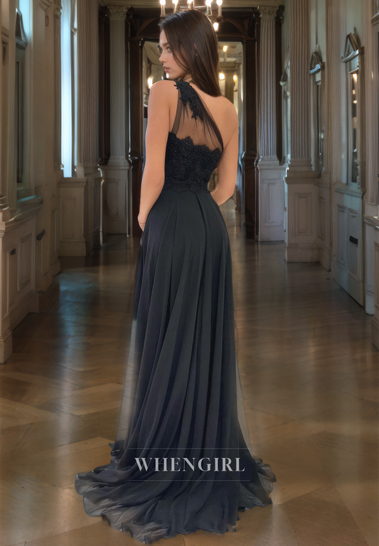 A-Line One Shoudler Appliques Long Prom Dress with High Side Slit and Train