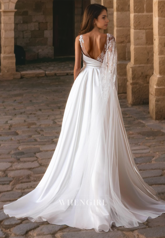 A-Line Off Shoulder Stripe Sleeveless High Slit Appliques Lace Wedding Dress Bridal Gowns with Train