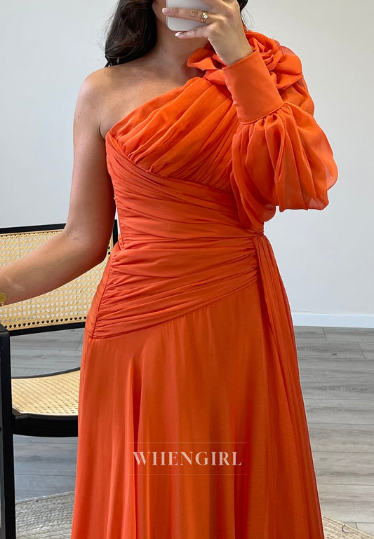 A-Line One Shoulder Side Slit Sweep Train Pleated Formal Evening Gown with Long Sleeve