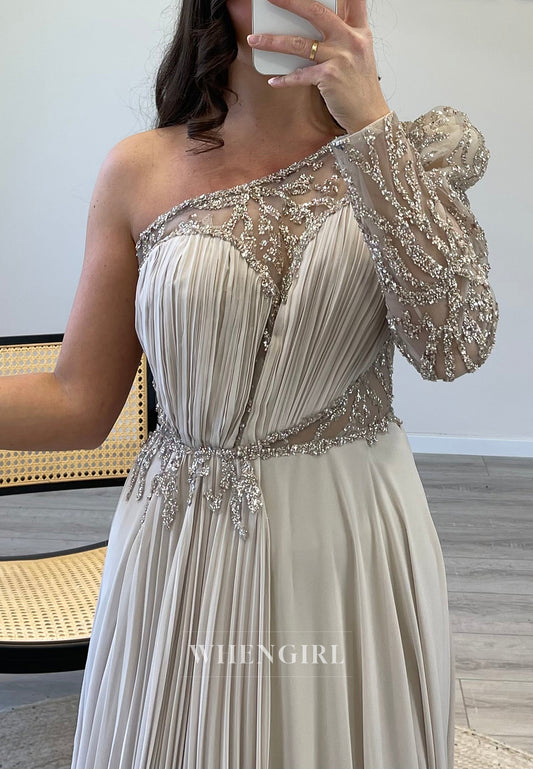 A-Line One Shoulder Beaded Evening Gown Long Sleeve Pleated Chiffon Formal Dress