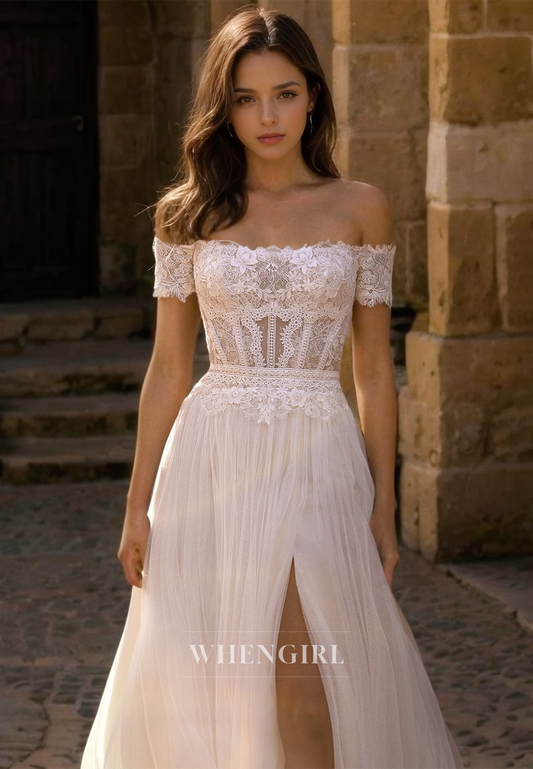 A-Line Off-Shoulder Sweetheart High Slit Appliques Stripe Lace Wedding Dress with Train Bridal Gowns
