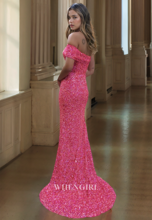 One Shoulder Sleeveless Formal Dress High Split Sheath Long Sequins Prom Dress with Train