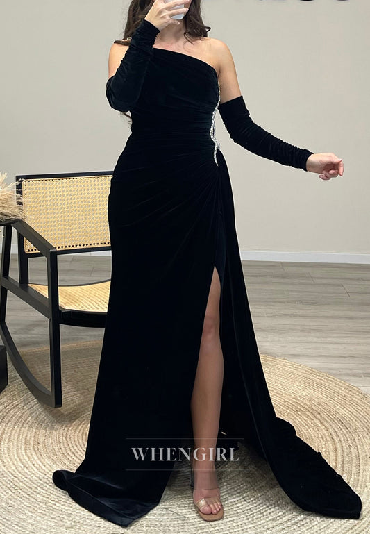 One Shoulder Side Slit Cut-out Pleated Velet Evening Dress with Long Sleeves