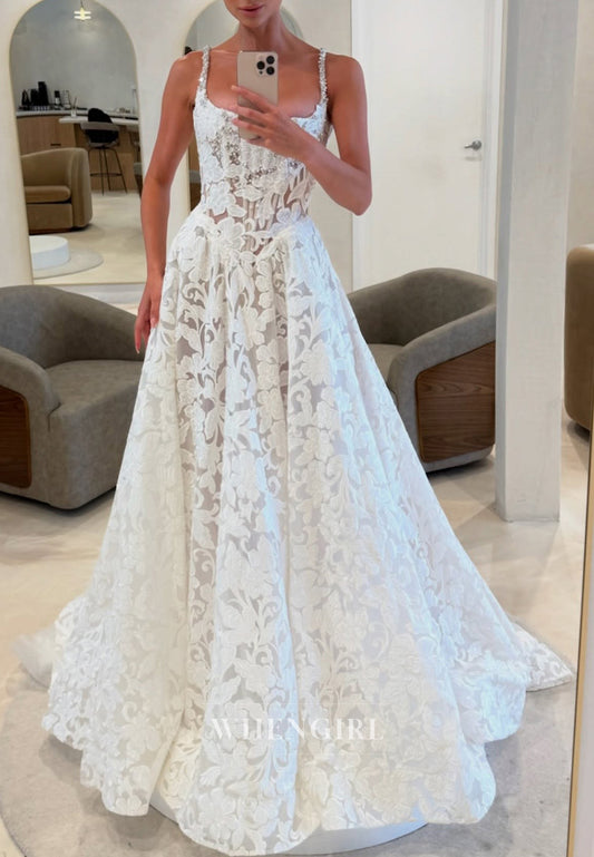 Square Neck Sleeveless Appliqued Beaded Straps A-Line Wedding Dress
