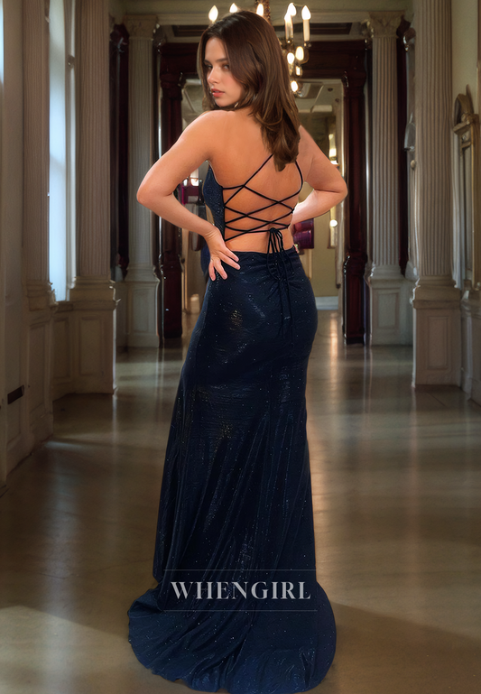 Sheath V Neck Straps Sleeveless Glitter Knit Long Prom Dress with High Side Slit and Train