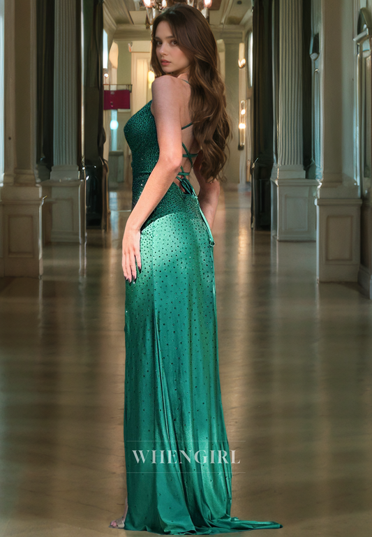 Sheath V Neck Straps Sleeveless Long Prom Dress with High Side Slit and Train