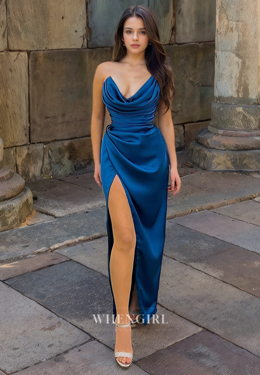 Sheath V Neck Sleeveless Pleated Long Prom Dress with High Side Slit