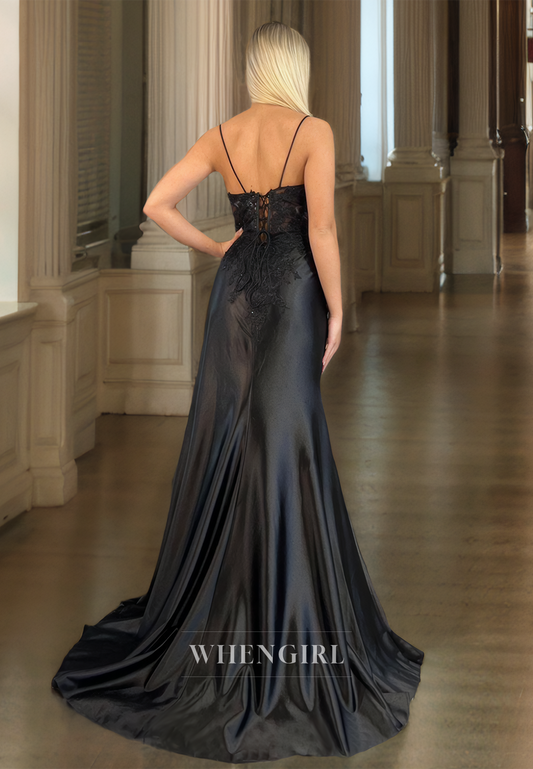 Spaghetti Straps V-Neck Side Slit Train Stripe Sheath Formal Prom Dress with Appliques