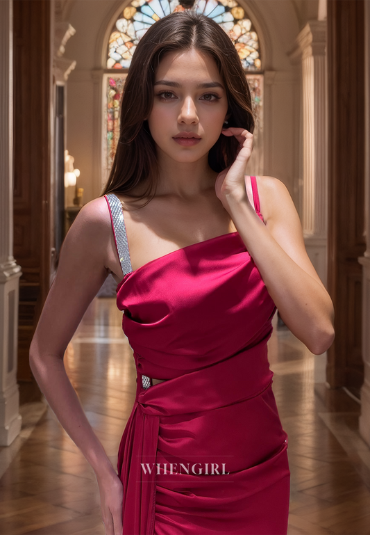 Spaghetti Straps Sweetheart Sheath Sweep Train Ruched Satin Prom Dress with Slit Party Dress