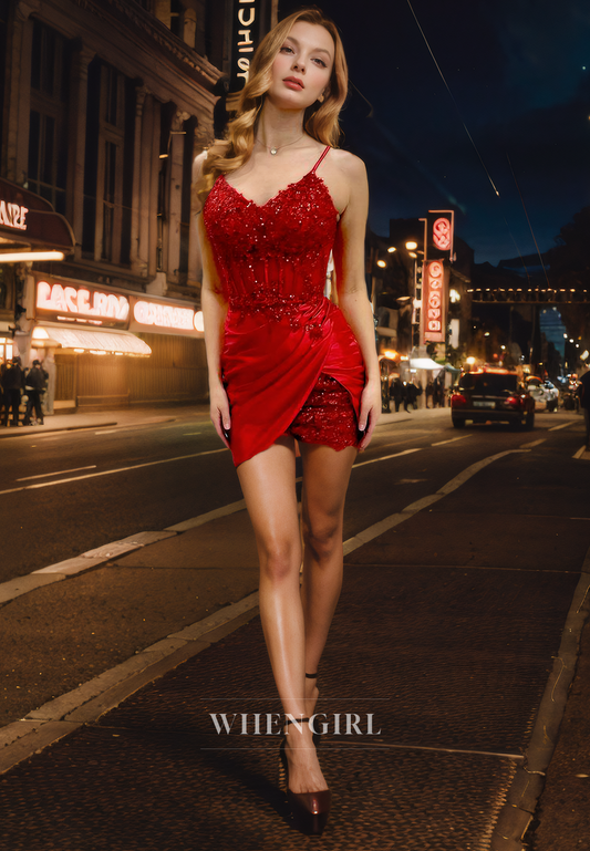 V Neck Sheath Spaghetti Straps Sleeveless Short Homecoming Dress