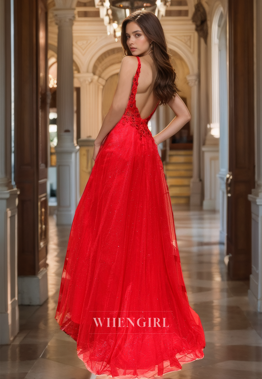 A-Line V-Neck Straps Sleeveless High Slit Appliques Lace Prom Dress with Train Formal Gowns