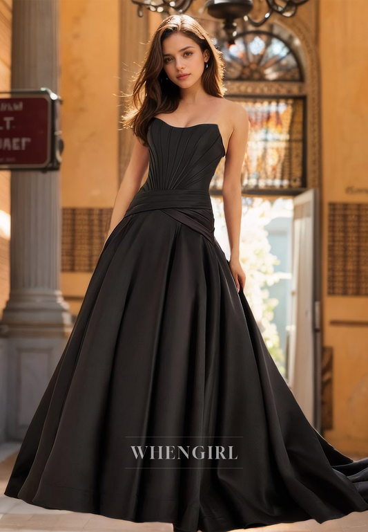 Tube Top Sleeveless A-Line Stripe Sweep Train Satin Party Dress with Pleats Prom Dress