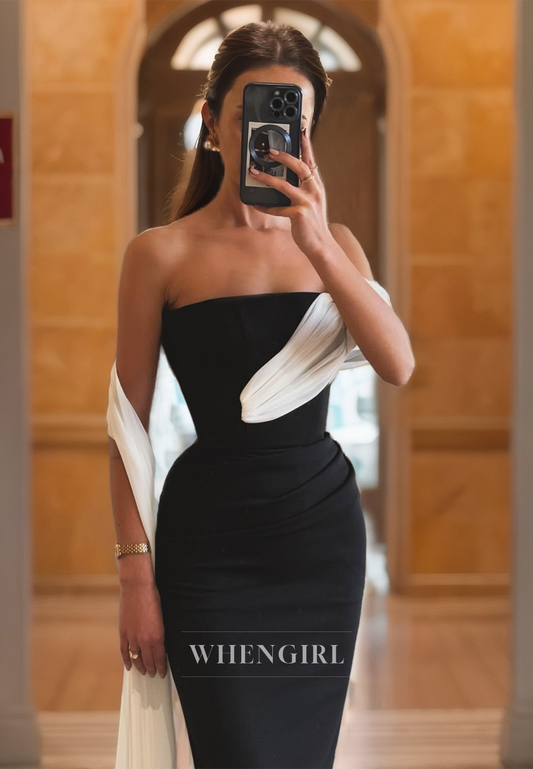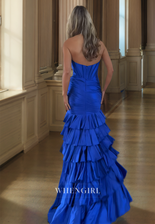 Sheath Strapless Pleated Long Prom Dress with High Side Slit and Train