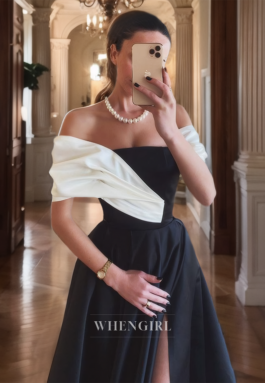 A-Line Off Shoulder Sleeveless Pleated Long Prom Dress with High Side Slit and Train