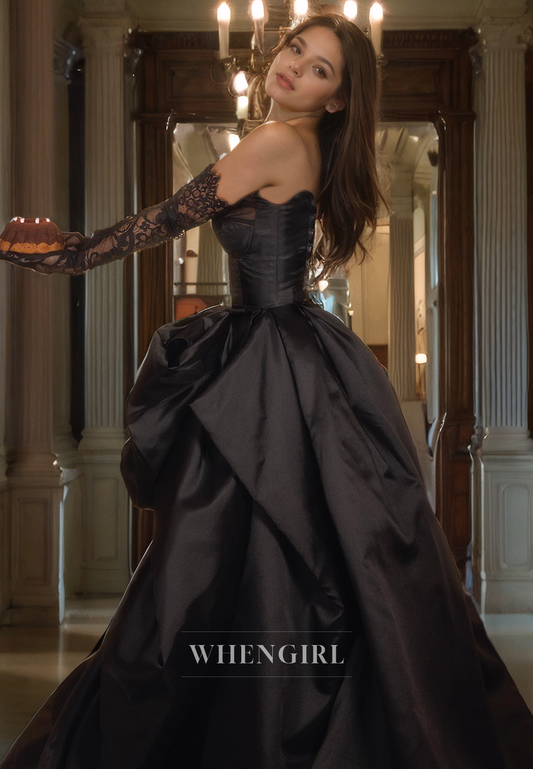 A-Line Strapless Sleevelss Beaded Long Prom Dress with High Side Slit and Train (without Gloves)