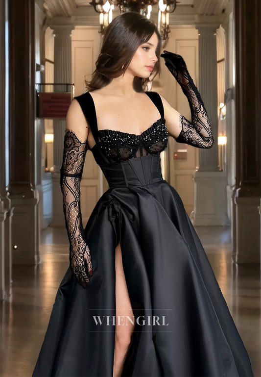 Sweetheart Sleeveless A-Line High Split Appliques Pleated Lace Prom Dress with Beads Evening Dress