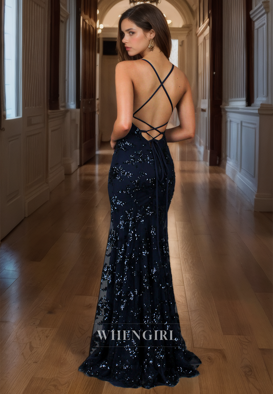 V-Neck Mermaid Sleeveless Stripe Floor-Length Glitter Lace Evening Gowns with Slit Prom Dress