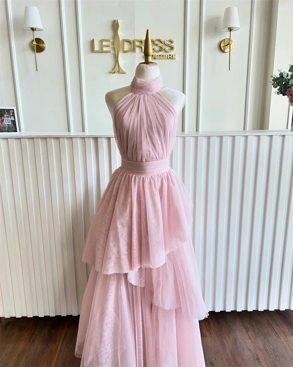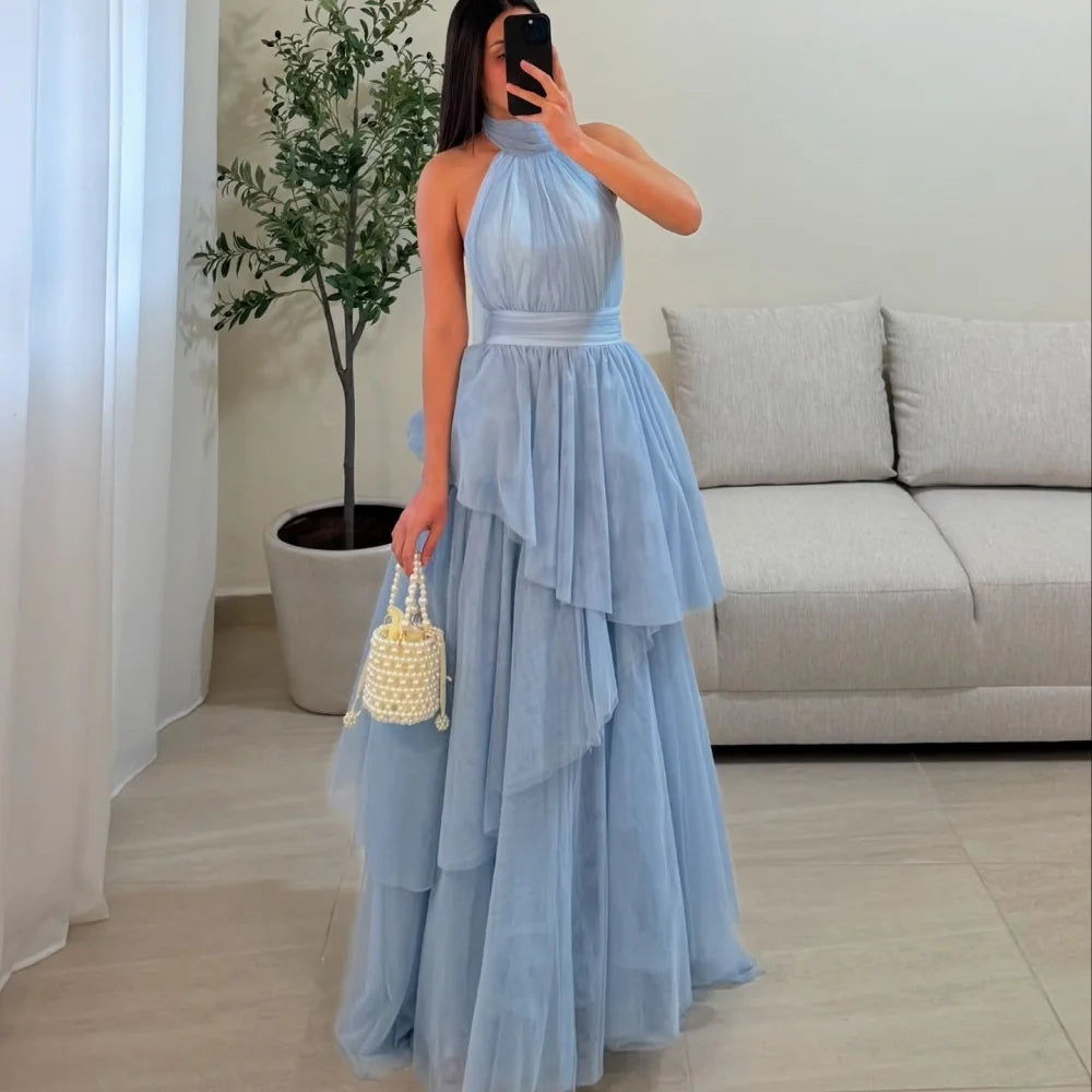 Customized Multi-Layered A-line Mesh Fabric robes de soirée Halter Neck Sleeveless Party Dresses Ankle-Length Prom Dress