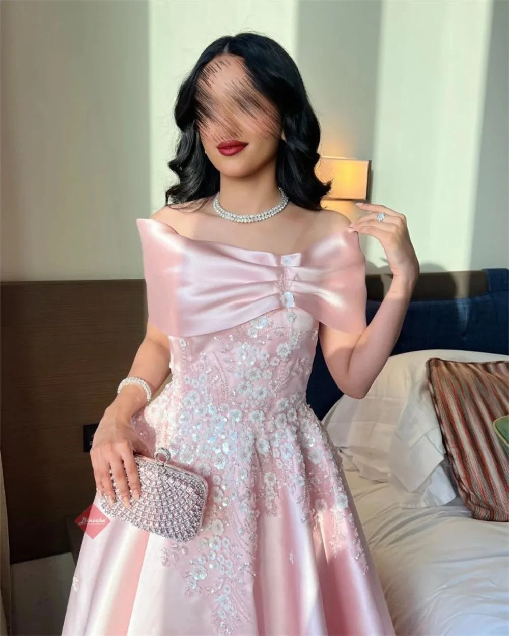 Pink Off Shoulder Sequinned Appliques Prom Dresses A-Line Lace-Up Sleeveless Evening Dress