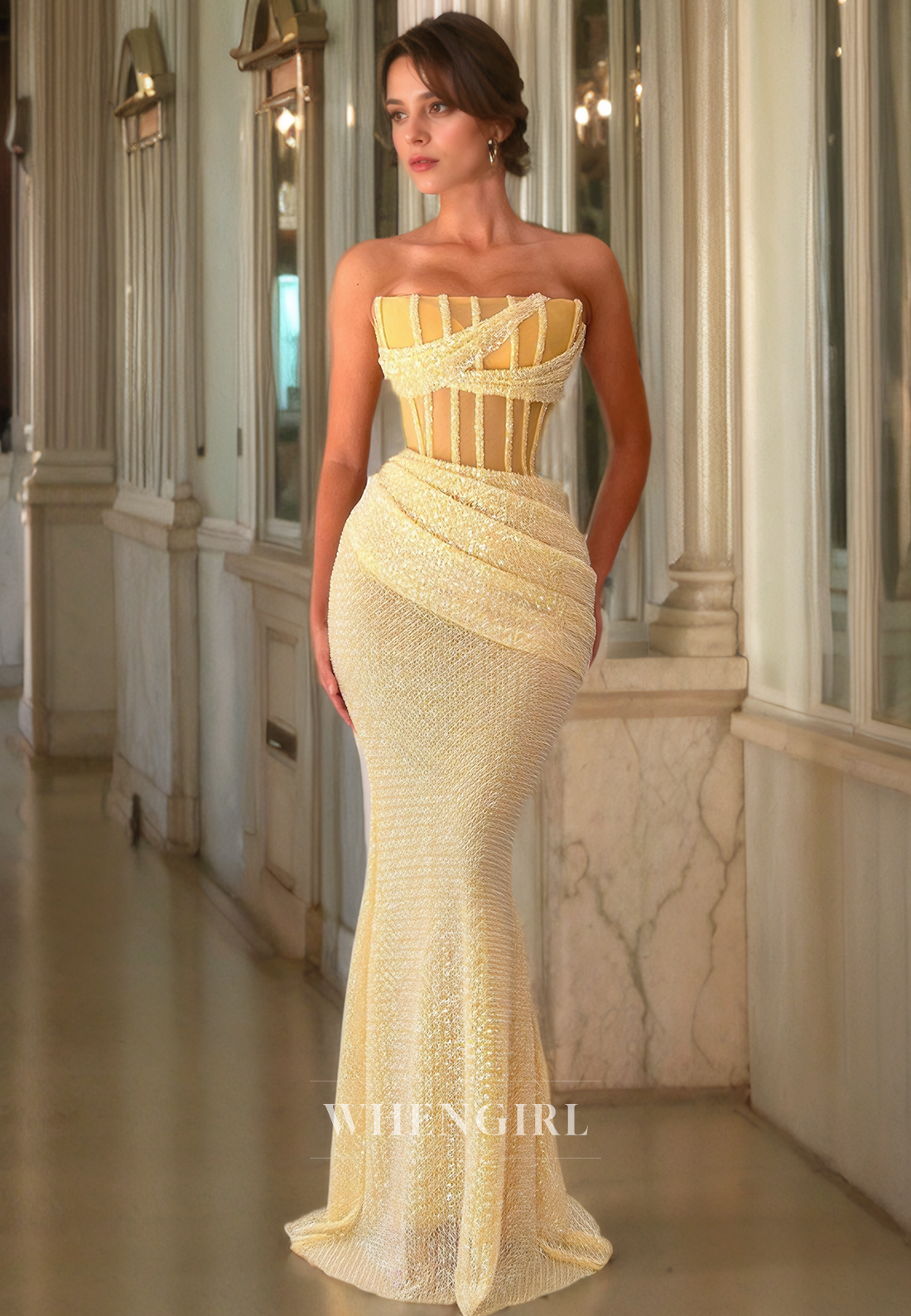 Mermaid Strapless Sleeveless Pleated Fully Sequins Long Prom Dress with Train