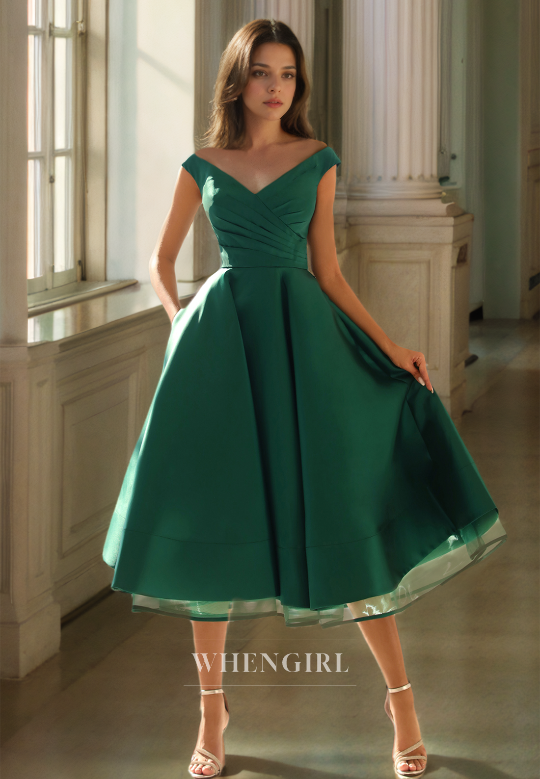 A-Line V-Neck Straps Sleeveless Tea-Length Pleated Lace Prom Dress Evening Dress