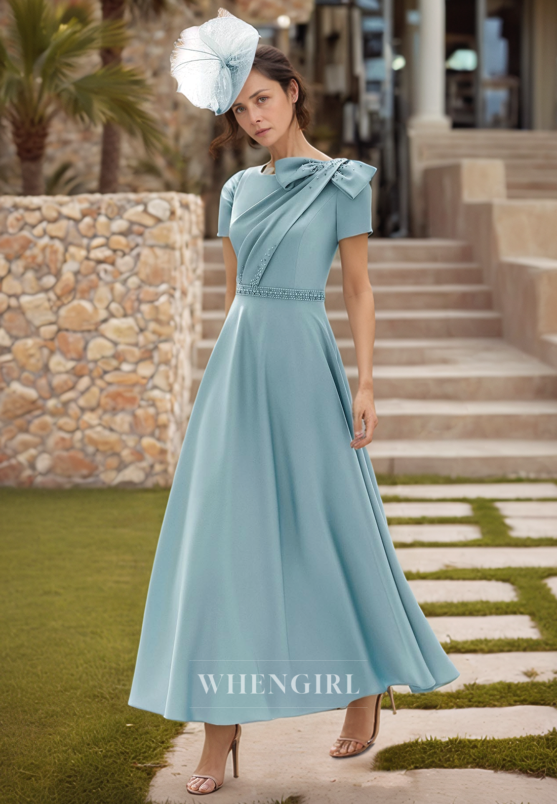 A Line Bateau Beading Short Sleeves Elegant Mother of the Bride Dress Cocktail Dress