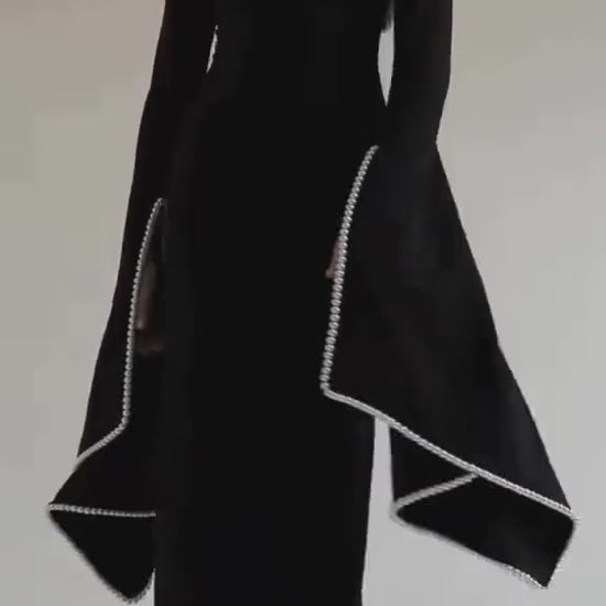 Step into the spotlight with this sheath evening gown that hugs your silhouette beautifully. Its bateau neckline and long sleeves offer a graceful touch, while delicate beaded pearls add just the right sparkle for a night to remember. Floor-length elegance meets playful charm, making it the perfect pick for any formal occasion where you want to shine effortlessly.