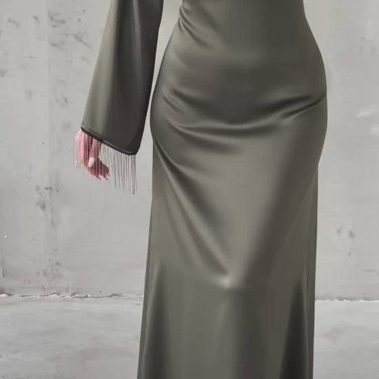 This refined ankle-length column dress features a simple high neckline and long sleeves, accented by elegant tassels that add subtle movement. Its minimalist design offers a sophisticated silhouette perfect for formal evening events, combining understated style with graceful charm.