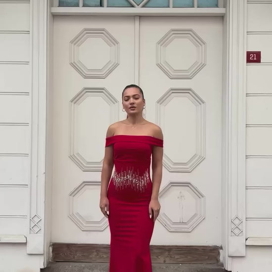 Dive into elegance with this stunning mermaid evening gown designed to make you feel absolutely radiant. The off-shoulder neckline creates a graceful, romantic silhouette while long sleeves provide sophisticated coverage. Intricate beading adorns the bodice, catching light with every movement and adding luxurious detail. The floor-length skirt flows beautifully, hugging your curves before cascading to the ground for a dramatic, show-stopping effect. Perfect for formal events, galas, or special occasions where you want to command attention. This dress celebrates your beauty and confidence, ensuring you'll feel like the best version of yourself all evening long.