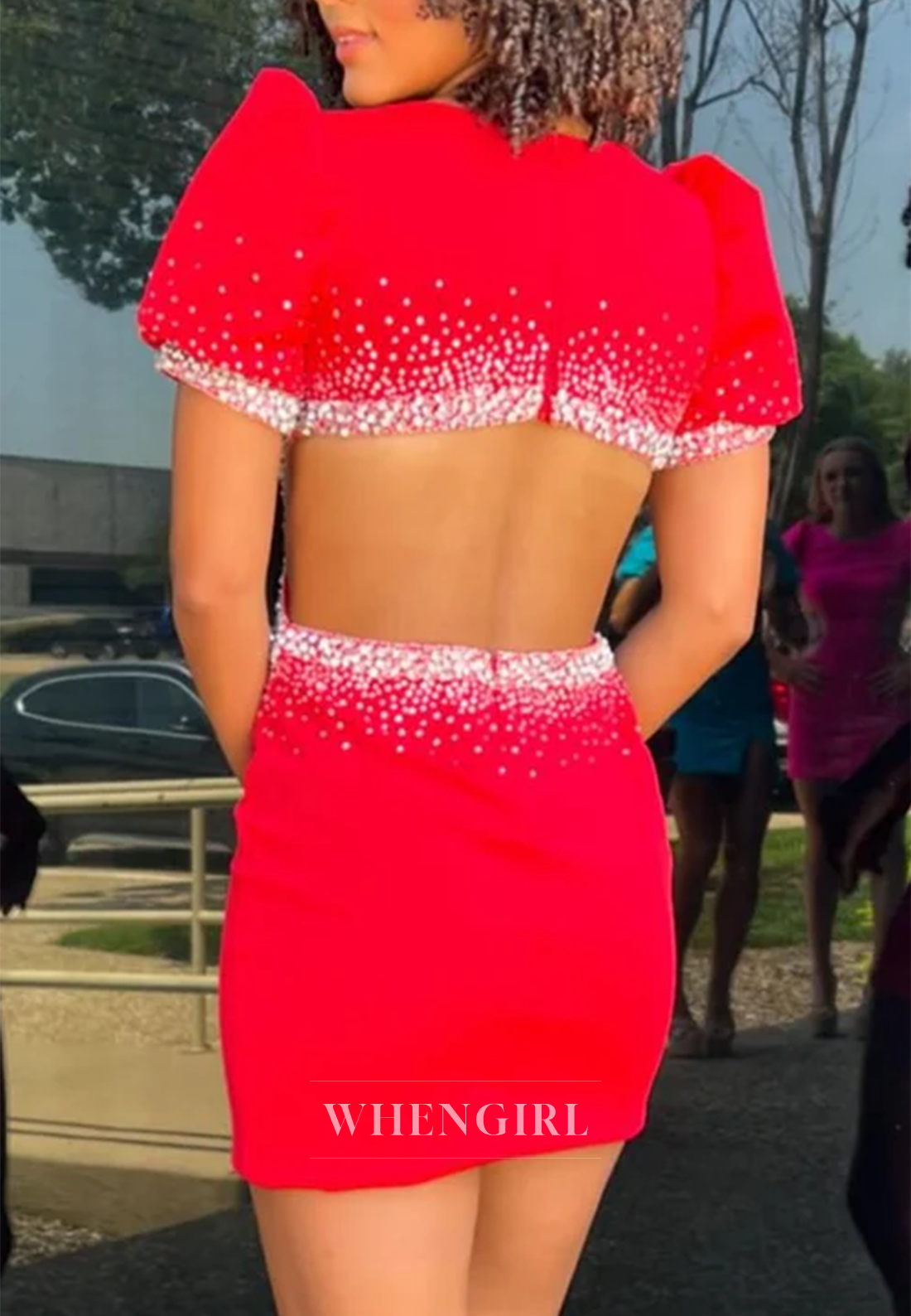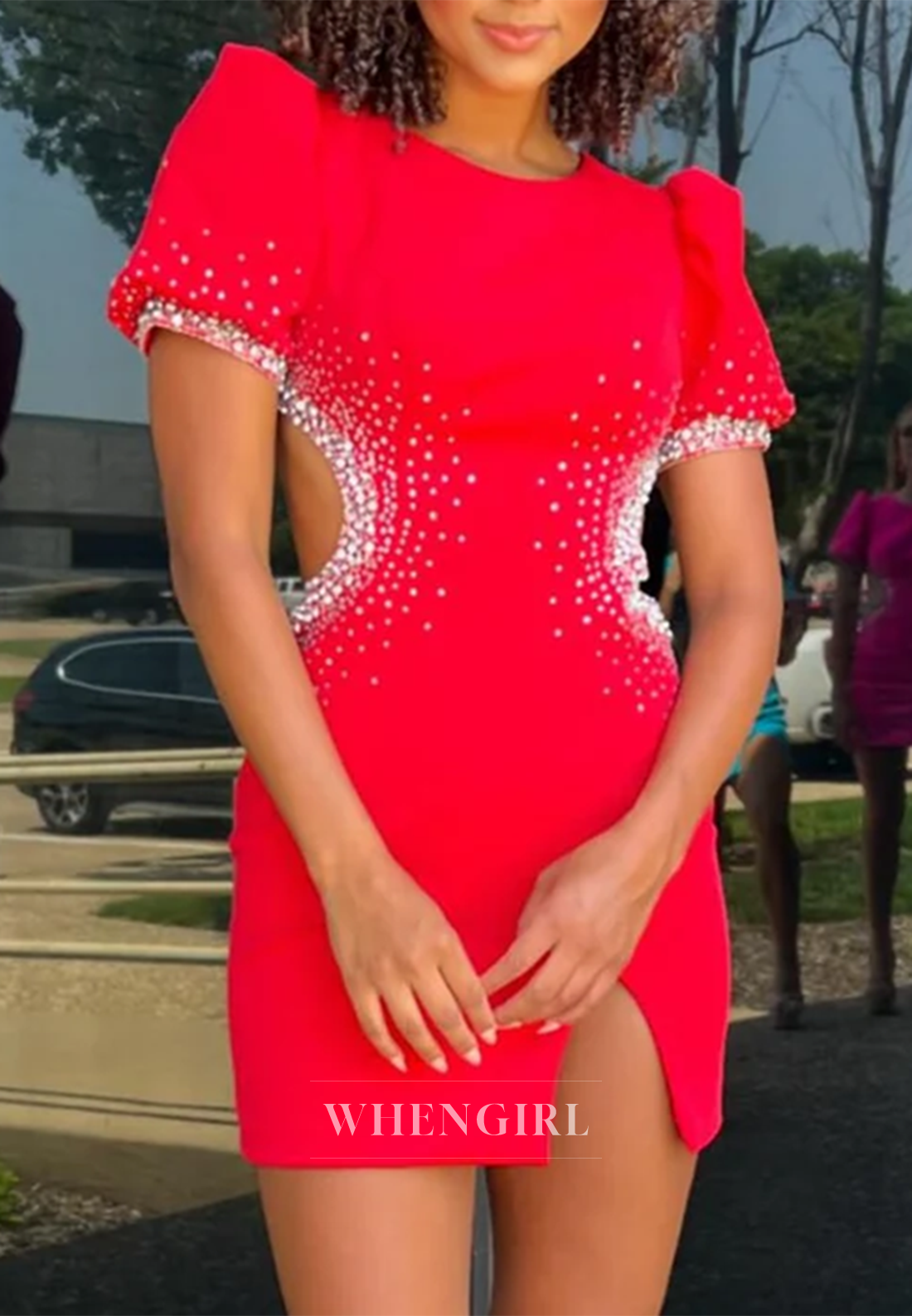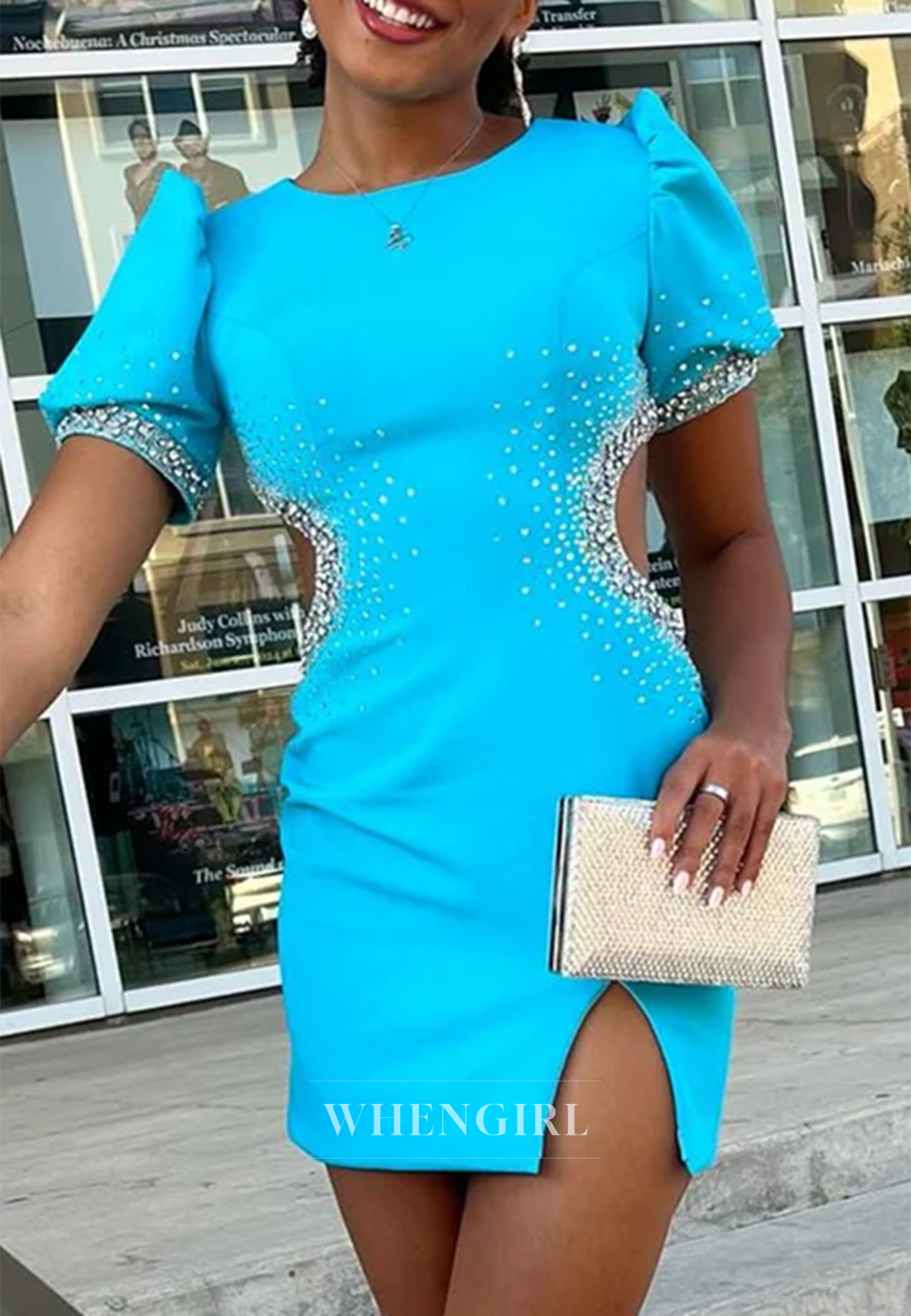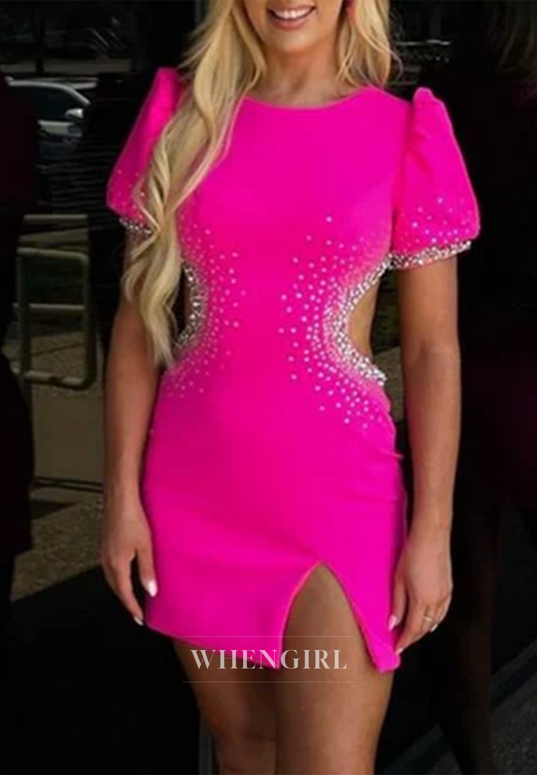 Sheath Bateau Neck Short Puff Sleeves Cut Out Side Slit Back Zipper Homecoming Dress