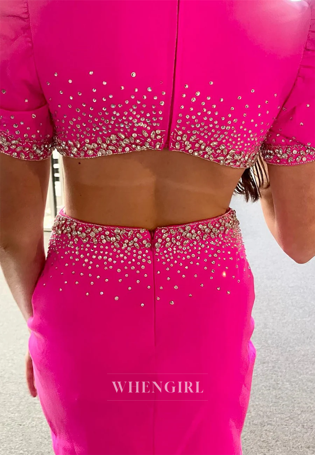 This sheath homecoming dress features a refined bateau neckline paired with short puff sleeves for a touch of classic elegance. Strategic cut-outs and a side slit add contemporary allure and ease of movement. A back zipper ensures a seamless fit, making this dress a sophisticated choice for a memorable evening.