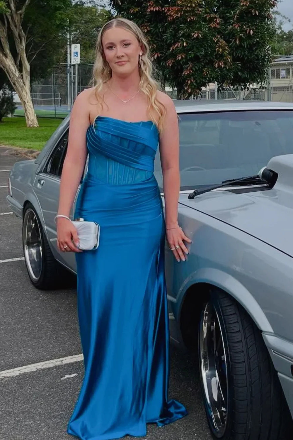 Elevate your prom night with this stunning mermaid gown. Crafted from luxurious satin and delicate lace, this strapless dress features shimmering gold sparkles that catch the light beautifully. The fitted mermaid silhouette hugs your curves before flowing gracefully to the floor, creating an elegant and dramatic look. Perfect for making an unforgettable entrance at any formal event.