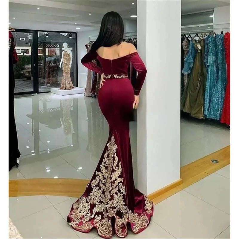 Red Wine Moroccan Kaftan Long Evening Dress Sexy Mermaid Dubai Formal Gowns Charming Gold Appliques Celebrity Dresses Plus Size