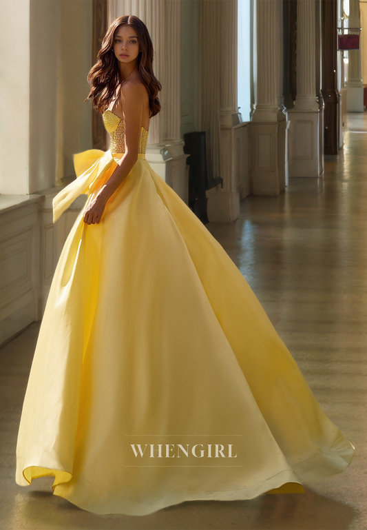 A-Line Sweetheart Sleeveless Stripe Bows Pleats Satin Prom Dress Evening Gowns with Beads
