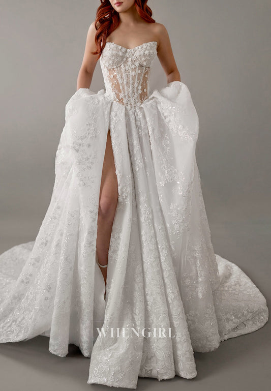 Ball Gown Tube Top Beaded Appliqued Lace Long Sleeves Side Slit Wedding Dress with Court Train