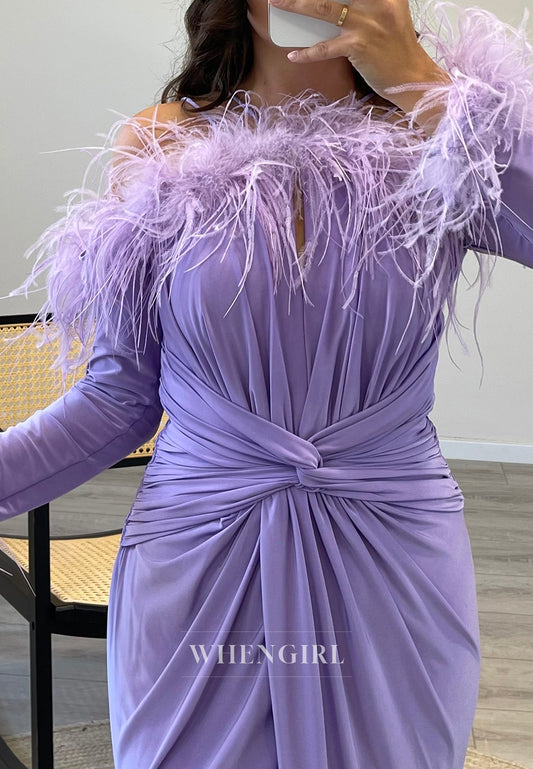 Pleated Long Sleeves Feather Mermaid Formal Gown Side Slit Chiffon Dress