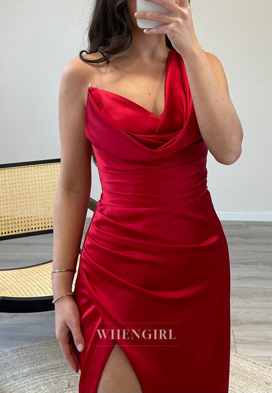 Red Asymmertrical Neck One Shoulder Side Slit Mermaid Pleated Evening Formal Dress
