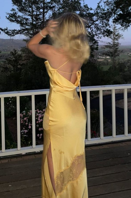Yellow Spaghetti Straps Cowl Neck Lace Hollow Out Backless Party Prom Dress