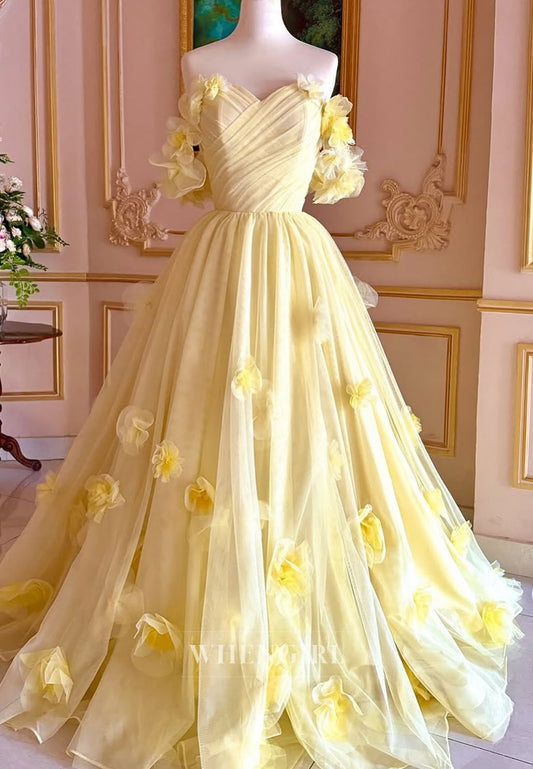 Yellow A-Line Sleeveless Formal Dress Pleated Floral Tulle Off Shoulder Evening Dress