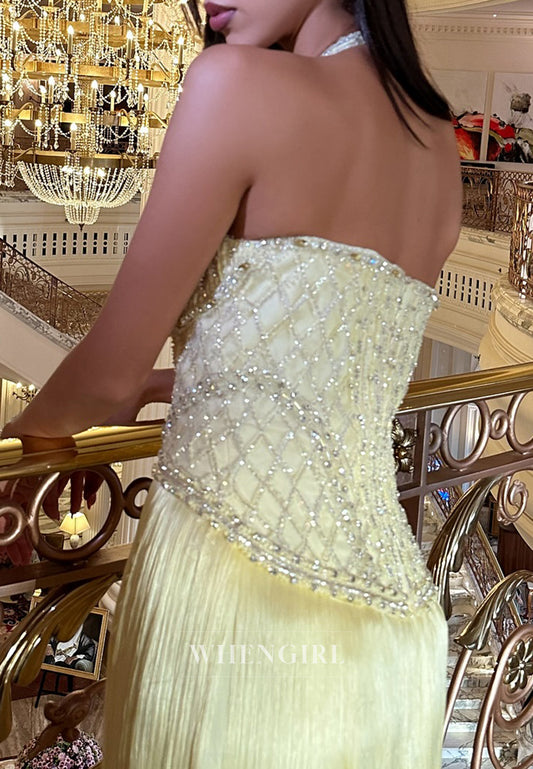 Yellow Halter Sleeveless Beaded Column Back Zipper Evening Dress