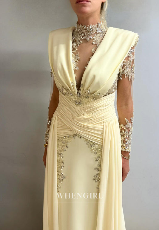 Yellow Beaded High Neck Long Sleeves Pleated Column Button Evening Dress