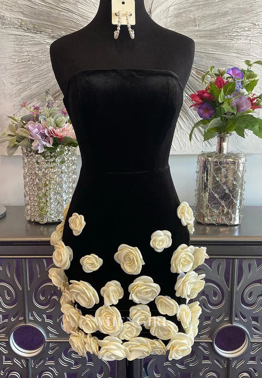 Black Sheath Tube Top Sleeveless Velvet White 3D Flower Short Homecoming Dress