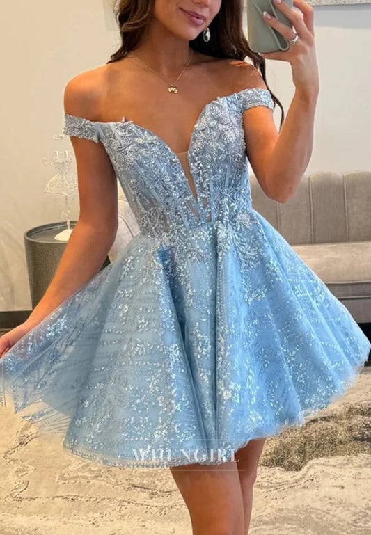 Sky Blue V Neck Off Shoulder Sleeveless Beaded Back Zipper A-Line Short Homecoming Dress