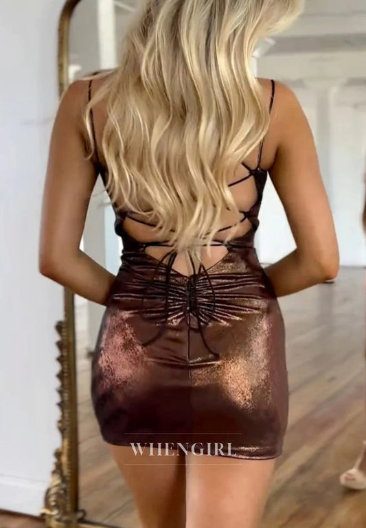 Chocolate V Neck Sleeveless Spaghetti Straps Pleated Lace Up Sheath Short Homecoming Dress