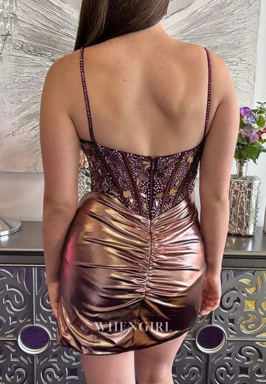 Taupe Spaghetti Straps Sleeveles Side Slit Cut Glass Mirro Sheath Short Homecoming Dress