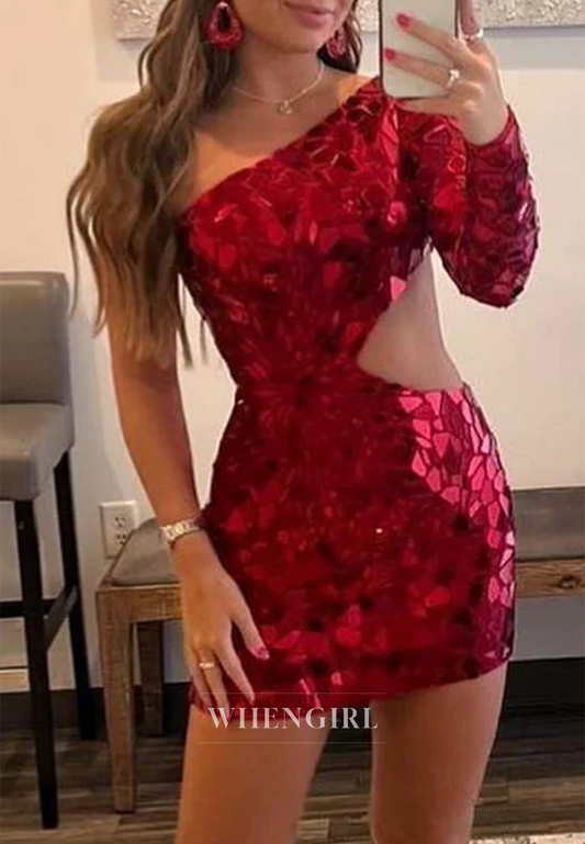 One Shoulder Cut Glass Mirro Cut Out Sheath Single Long Sleeve Homecoming Dress