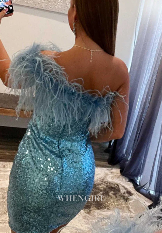 Sheath Sleeveless Feather One Shoulder Sequins Back Zipper Homecoming Dress